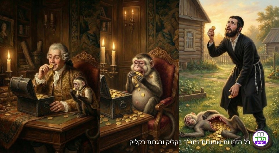 באותם ימים לפריץ שמושיק היהודי עבד אצלו היתה חיית מחמד, קוף והקוף הזה היה נמצא איתו תמיד. ולאותו פריץ הייתה כספת שבה הוא היה שומר את מטבעות הזהב שלו וכל יום היה סופר אותם מחדש וכל מטבע שהיה סופר הוא היה נושך כדי לוודא שהוא חזק ובאמת מדובר במטבע זהב. יום אחד יצא הפריץ מחדרו ושכח לסגור את הכספת שלו. נכנס הקוף וישב בכיסא הפריץ וחזר על הפעולה שהיה רואה את הפריץ עושה. אך במקום לנשוך את מטבעות הוא התחיל לבלוע אותם אחד אחרי השני עד שבטנו התמלאה במטבעות זהב והוא נפל ומת.