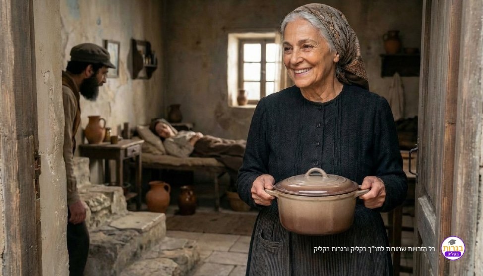 תוך כדי כך מגיעה תהילה אל בית הרבנית עם סיר של תבשיל בשביל הרבנית החולה.